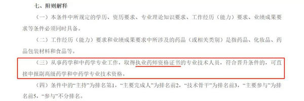 從事藥學(xué)和中藥學(xué)專業(yè)工作,取得執(zhí)業(yè)藥師資格證書的專業(yè)技術(shù)人員,符合晉升條件的,可直接申報副高級藥學(xué)和中藥學(xué)專業(yè)技術(shù)資格。