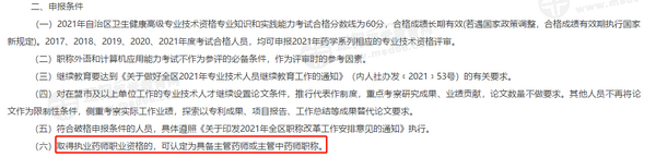 如果是申報副主任藥師(副主任中藥師),則要滿足部分聘任條件,其中有明確“取得主管藥師(主管中藥師)職稱或執(zhí)業(yè)藥師職業(yè)資格”為條件之一。