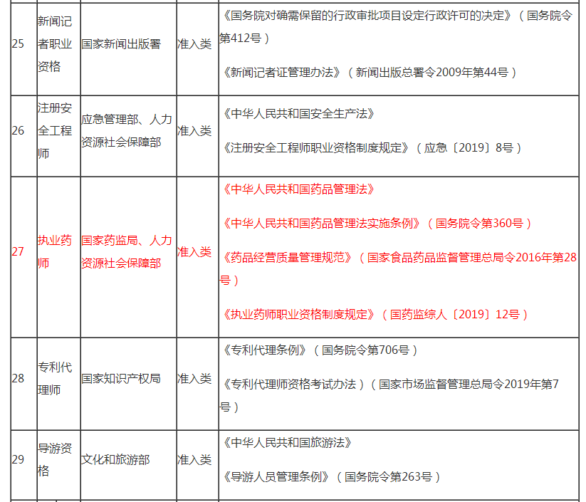 新版準(zhǔn)入類考試目錄