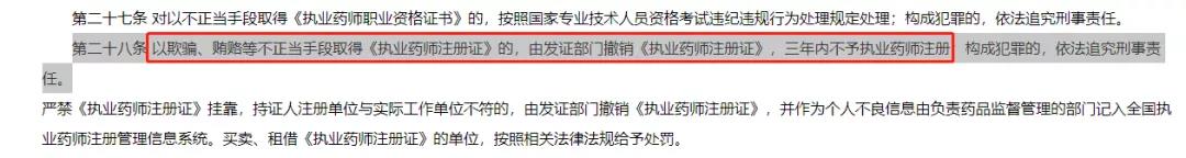 根據(jù)公告內(nèi)容,官方在“全國專業(yè)技術(shù)人員職業(yè)資格證書驗證查詢系統(tǒng)”上未查詢到這44名執(zhí)業(yè)藥師職業(yè)資格信息。也就是說,這44名是以欺騙、賄賂等不正當手段取得《執(zhí)業(yè)藥師注冊證》的。