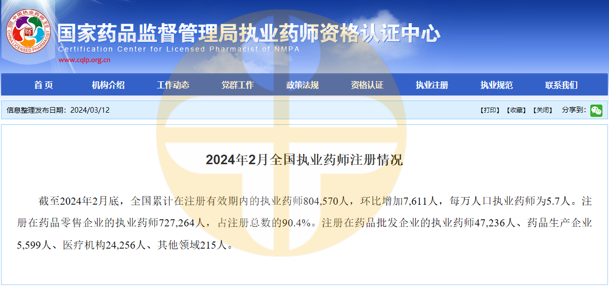 3月12日,國家食品藥品監(jiān)督管理局執(zhí)業(yè)藥師資格認證中心發(fā)布消息,截至2024年2月底,成功注冊在醫(yī)療機構(gòu)的執(zhí)業(yè)藥師為24,256名。