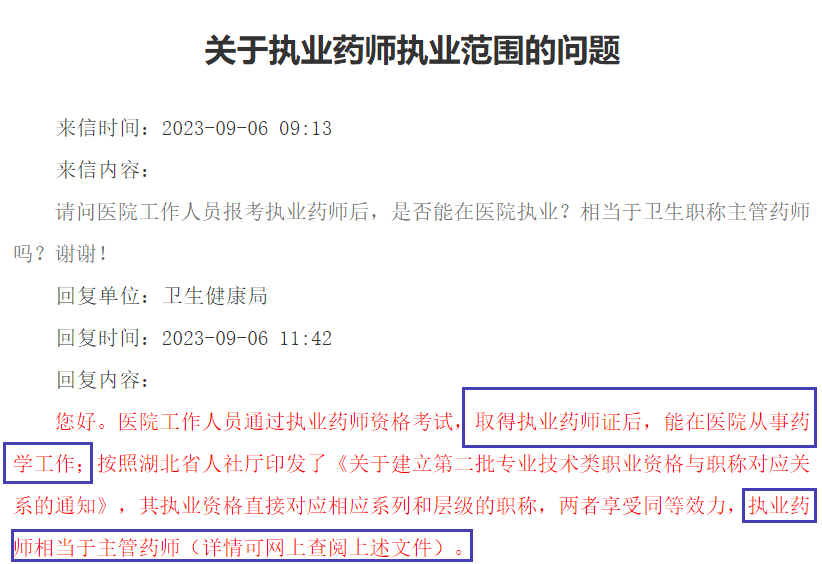 同年,湖北??悼h人民政府回復關(guān)于“執(zhí)業(yè)藥師執(zhí)業(yè)范圍”的咨詢,其中明確:醫(yī)院工作人員通過執(zhí)業(yè)藥師考試,取得執(zhí)業(yè)藥師證后,能在醫(yī)院從事藥學工作,且執(zhí)業(yè)藥師相當于主管藥師。