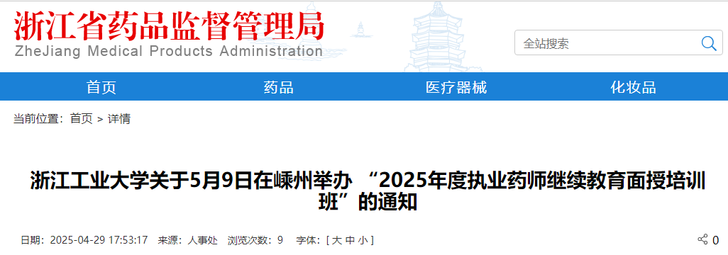 【浙江】浙江工業(yè)大學(xué)關(guān)于5月9日在嵊州舉辦 “2025年度執(zhí)業(yè)藥師繼續(xù)教育面授培訓(xùn)班”的通知