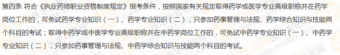 符合《執(zhí)業(yè)藥師職業(yè)資格制度規(guī)定》報(bào)考條件,按照國(guó)家有關(guān)規(guī)定取得藥學(xué)或醫(yī)學(xué)專(zhuān)業(yè)高級(jí)職稱(chēng)并在藥學(xué)崗位工作的,可免試藥學(xué)專(zhuān)業(yè)知識(shí)(一)、藥學(xué)專(zhuān)業(yè)知識(shí)(二),只參加藥事管理與法規(guī)、藥學(xué)綜合知識(shí)與技能兩個(gè)科目的考試;取得中藥學(xué)或中醫(yī)學(xué)專(zhuān)業(yè)高級(jí)職稱(chēng)并在中藥學(xué)崗位工作的,可免試中藥學(xué)專(zhuān)業(yè)知識(shí)(一)、中藥學(xué)專(zhuān)業(yè)知識(shí)(二),只參加藥事管理與法規(guī)、中藥學(xué)綜合知識(shí)與技能兩個(gè)科目的考試。