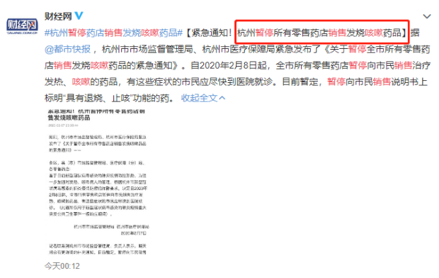 同時(shí),杭州市市場(chǎng)局負(fù)責(zé)人表示,今天將會(huì)有更詳細(xì)的補(bǔ)充通知。目前暫定,暫停向市民銷(xiāo)售說(shuō)明書(shū)上標(biāo)明“具有退燒、止咳”功能的藥。
