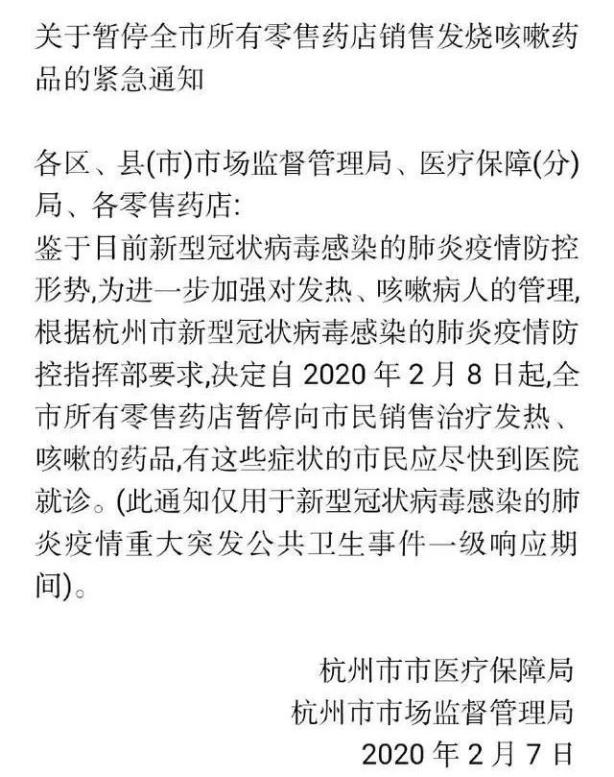 杭州市市場(chǎng)局、醫(yī)保局緊急發(fā)布了《關(guān)于暫停全市所有零售藥店銷(xiāo)售發(fā)燒咳嗽藥品的緊急通知》?!锻ㄖ窙Q定自2020年2月8日起,全市所有零售藥店暫停向市民銷(xiāo)售治療發(fā)熱、咳嗽的藥品,有這些癥狀的市民應(yīng)盡快到醫(yī)院就診。(此通知僅用于新型冠狀病毒感染的肺炎疫情重大突發(fā)公共衛(wèi)生事件一級(jí)響應(yīng)期間)。