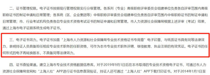 上海明確表示:電子證書加蓋“上海市人力資源和社會保障局專業(yè)技術(shù)資格證書專用章”電子印章,與紙質(zhì)證書具有同等法律效力,表明持證人員具備擔(dān)任相應(yīng)專業(yè)技術(shù)職務(wù)的任職資格,可作為本市專業(yè)技術(shù)職務(wù)評聘、繼續(xù)教育、執(zhí)業(yè)注冊的有效憑證。