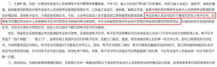 浙江省也發(fā)過相關(guān)通知:全面推行電子化成績合格證明,且與資格證書具有同等效用。且還強(qiáng)調(diào)與傳統(tǒng)拿紙質(zhì)證書相比,電子證書可提速4個月甚至大半年以上。對遺失的往年發(fā)放的紙質(zhì)證書,今后也不再補(bǔ)辦紙質(zhì)證書,持證人可以自行下載打印電子證書作為更換。