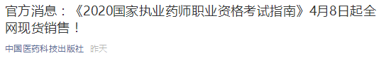 就在剛剛,2020年執(zhí)業(yè)藥師官方教材出版社“中國醫(yī)藥科技出版社”發(fā)布通知“官方消息:《2020國家執(zhí)業(yè)藥師職業(yè)資格考試指南》4月8日起全網(wǎng)現(xiàn)貨銷售!”,通知表明,2020年執(zhí)業(yè)藥師官方教材已經(jīng)就位!