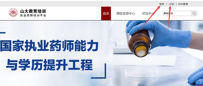 1、進(jìn)入官網(wǎng):(點(diǎn)擊進(jìn)入>)點(diǎn)擊右側(cè)“執(zhí)業(yè)藥師能力與學(xué)歷提升”;