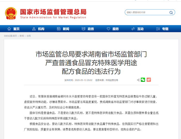 國(guó)家市場(chǎng)監(jiān)督管理總局在5月15日,提出湖南省市場(chǎng)監(jiān)督管理局對(duì)涉事商家進(jìn)行徹查,從嚴(yán)從重處罰的要求。