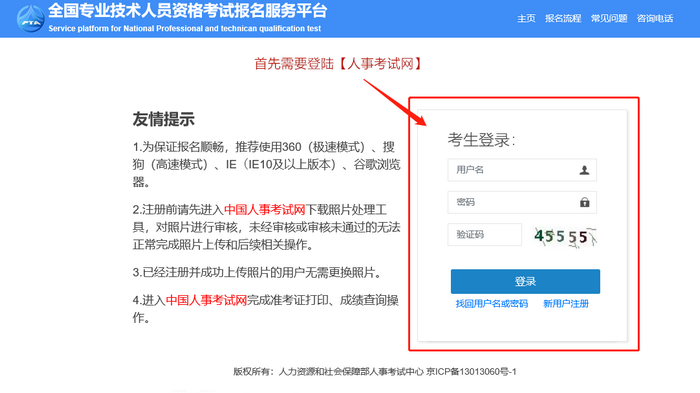 登陸【人事考試網(wǎng)】,如果未注冊的可以選擇【新用戶注冊】