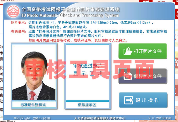 有關說明:點擊打開照片按鈕選擇照片文件,通過審核照片將在照片顯示區(qū)域顯示照片效果,確認無誤后輸入驗證碼,單擊上傳照片按鈕進行上傳,上傳成功后退出操作。如未經(jīng)過審核,請單擊退出操作按鈕,到中國人事考試網(wǎng)或當?shù)厝耸驴荚嚲W(wǎng)站下載照片審核工具對照片進行審核。通過審核后再進行照片上傳操作。