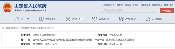 今年5月,山東省人民政府官網(wǎng)發(fā)布了《山東省加快流程再造推進“一業(yè)一證”改革試點實施方案》(以下簡稱《方案》)。