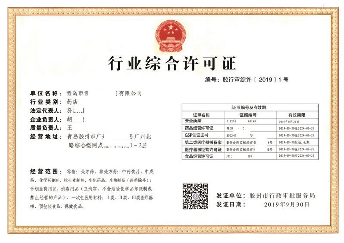 同時,從市場反饋來看,目前在山東省多地藥店版《行業(yè)綜合許可證》已頒發(fā),具體樣式如下: