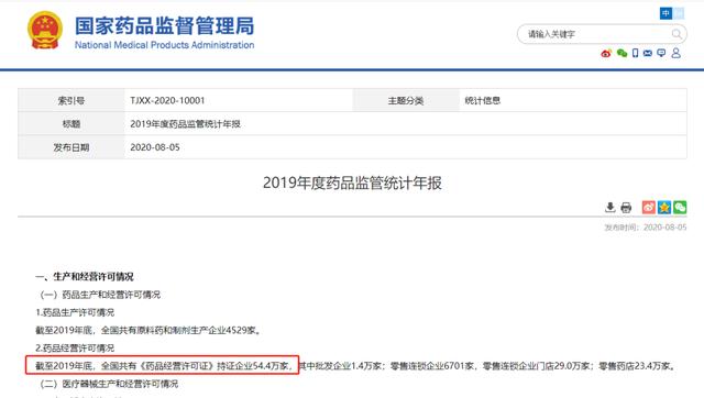 根據(jù)國(guó)家藥品監(jiān)督管理局2020年8月5日發(fā)布的《2019年度藥品監(jiān)管統(tǒng)計(jì)年報(bào)》中顯示,截止2019年底,全國(guó)共有《藥品經(jīng)營(yíng)許可證》持證企業(yè)54.4萬(wàn)家,其中批發(fā)企業(yè)1.4萬(wàn)家,零售連鎖企業(yè)6701家,零售連鎖企業(yè)門(mén)店29萬(wàn)家,零售藥店23.4萬(wàn)家。