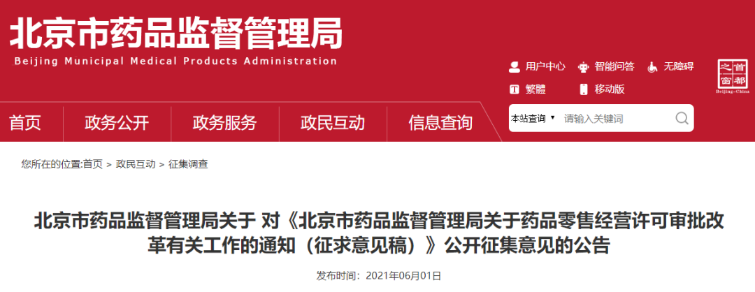 6月1日,北京市藥品監(jiān)督管理局發(fā)布了《北京市藥品監(jiān)督管理局關于藥品零售經(jīng)營許可審批改革有關工作的通知(征求意見稿)》(以下簡稱《意見稿》),公開向社會征求意見。