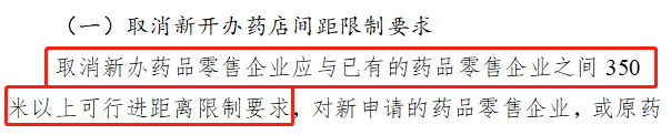 《征求意見稿》表示,為進一步深化我市藥品流通領域“放管服”改革優(yōu)化營商環(huán)境,簡化審批手續(xù)、提高審批效能,取消北京市新辦藥品零售企業(yè)應與已有的藥品零售企業(yè)之間350米以上可行進距離限制要求,對新申請的藥品零售企業(yè),或原藥品零售企業(yè)申請變更注冊地址的,與已有藥店的距離不再作為許可審查條件。
