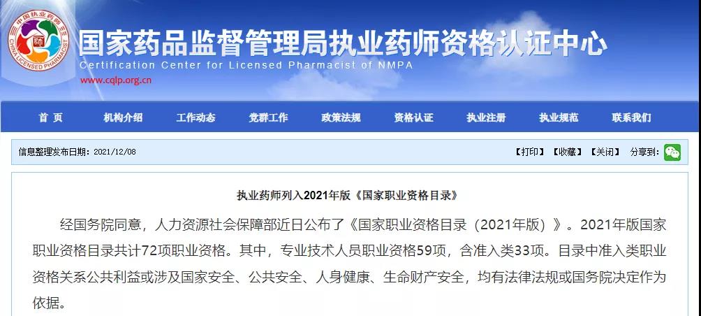 12月8日,國(guó)家藥監(jiān)局執(zhí)業(yè)藥師資格認(rèn)證中心發(fā)布消息,明確執(zhí)業(yè)藥師列入2021年版《國(guó)家職業(yè)資格目錄》。