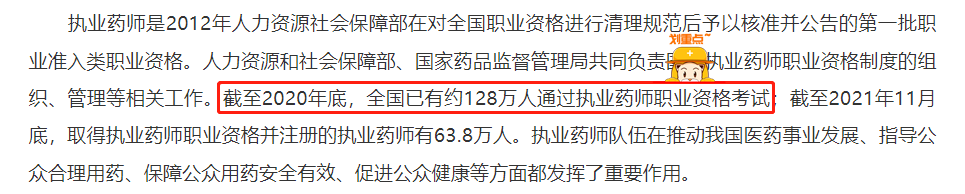 隨后,官方公布了一組數(shù)據(jù):“截至2020年底,全國(guó)已有約 128萬人通過執(zhí)業(yè)藥師職業(yè)資格考試;截至2021年11月底,取得執(zhí)業(yè)藥師職業(yè)資格并注冊(cè)的執(zhí)業(yè)藥師有63.8萬人。”