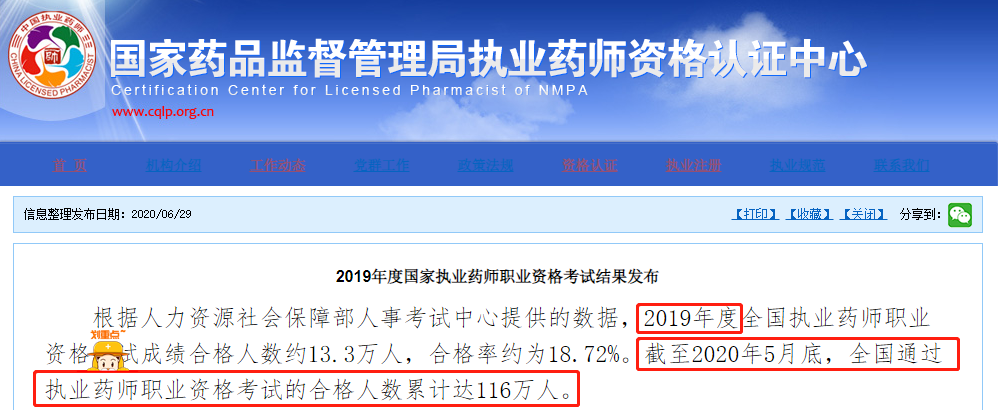 看到這個(gè)數(shù)據(jù),小編立馬去查閱了官方往期公布的通知,找到了2019年執(zhí)業(yè)藥師考后公布的信息。2020年6月29日,國(guó)家藥監(jiān)局執(zhí)業(yè)藥師資格認(rèn)證中心發(fā)布信息,“截止2020年5月底,全國(guó)通過執(zhí)業(yè)藥師職業(yè)資格考試的合格人數(shù)累計(jì)達(dá) 116萬人”。