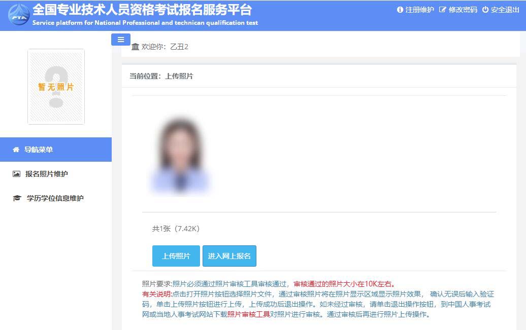 系統(tǒng)彈出照片上傳成功的提示。點(diǎn)擊【進(jìn)入網(wǎng)上報(bào)名】按鈕,進(jìn)行網(wǎng)上報(bào)名。