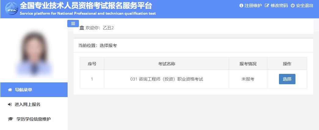 照片上傳完成后,點(diǎn)擊左側(cè)的【進(jìn)入網(wǎng)上報(bào)名】進(jìn)入選擇考試界面(見下圖)。