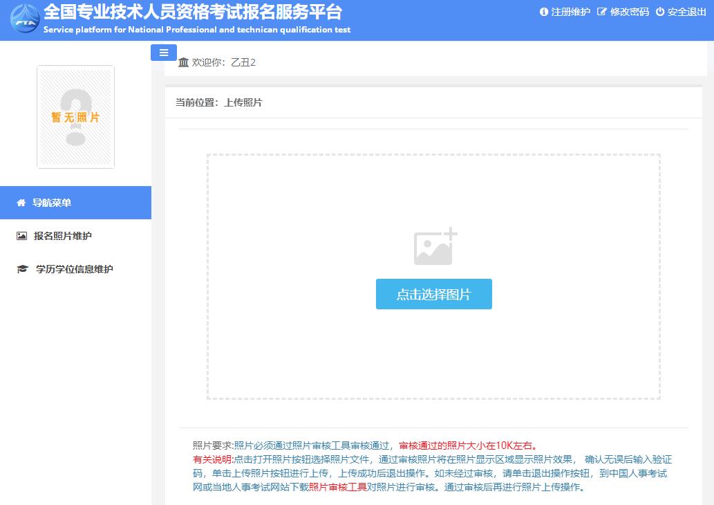 考生登錄系統(tǒng)后,按照操作提示進(jìn)行報(bào)名。如果考生沒有上傳照片,考生需上傳照片,系統(tǒng)會(huì)自動(dòng)調(diào)轉(zhuǎn)到上傳照片頁(yè)面,如圖: