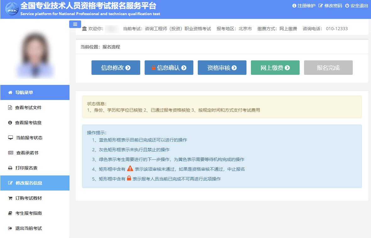 保存報(bào)名信息后,進(jìn)入報(bào)考人員狀態(tài)界面(見下圖)。