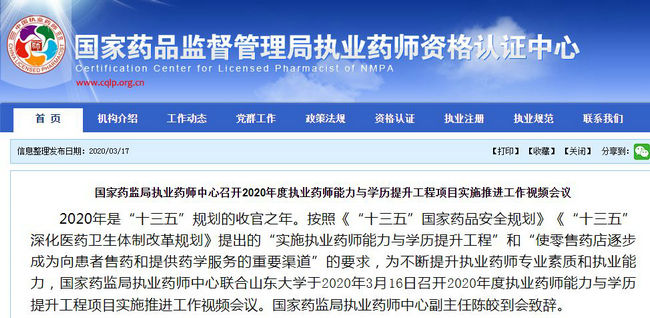 2020年3月18日,國家藥品監(jiān)督管理局執(zhí)業(yè)藥師資格認(rèn)證中心發(fā)布《國家藥監(jiān)局執(zhí)業(yè)藥師中心召開2020年度執(zhí)業(yè)藥師能力與學(xué)歷提升工程項目實施推進(jìn)工作視頻會議》的消息,該視頻會議主要是為了推進(jìn)全國執(zhí)業(yè)藥師能力與學(xué)歷提升工程項目實施!