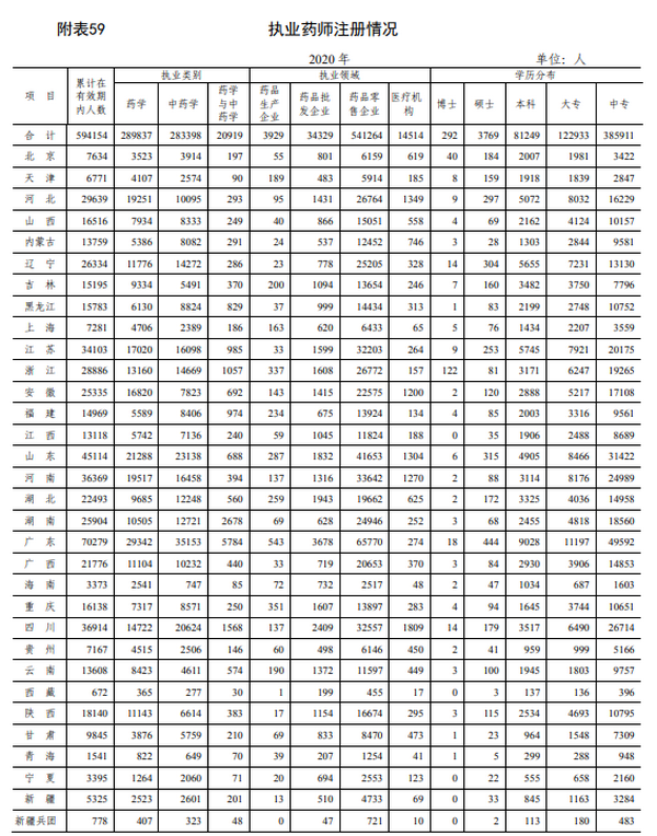 《報(bào)告》指出,2020年共有3.96萬(wàn)人獲得藥學(xué)類(lèi)執(zhí)業(yè)藥師資格,8.73萬(wàn)人獲得中藥學(xué)類(lèi)執(zhí)業(yè)藥師資格。截至2020年底,全國(guó)累計(jì)在有效期內(nèi)的執(zhí)業(yè)藥師人數(shù)為59.42萬(wàn)人,注冊(cè)人數(shù)同比增加15.16%。注冊(cè)人員執(zhí)業(yè)領(lǐng)域分布為:藥品生產(chǎn)企業(yè)0.66%、藥品批發(fā)企業(yè)5.78%,藥品零售企業(yè)91.10%,醫(yī)療機(jī)構(gòu)2.44%。2020年全國(guó)執(zhí)業(yè)藥師注冊(cè)人數(shù)前5位的省份依次為廣東、山東、四川、河南、江蘇。