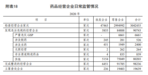 在監(jiān)管方面,《報(bào)告》披露,2020年各級(jí)監(jiān)管機(jī)構(gòu)共檢查藥品經(jīng)營(yíng)企業(yè)304.25萬(wàn)家次。其中,檢查批發(fā)企業(yè)4.75萬(wàn)家次,發(fā)現(xiàn)存在違反藥品經(jīng)營(yíng)相關(guān)管理規(guī)定行為的企業(yè)5855家次,完成整改6451家次。檢查零售企業(yè)299.50萬(wàn)家次,發(fā)現(xiàn)存在違反藥品經(jīng)營(yíng)相關(guān)管理規(guī)定行為的企業(yè)8.49萬(wàn)家次,完成整改9.18萬(wàn)家次。
