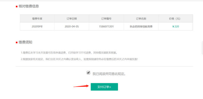 2、核對(duì)繳費(fèi)信息,并勾選同意繳費(fèi)須知。