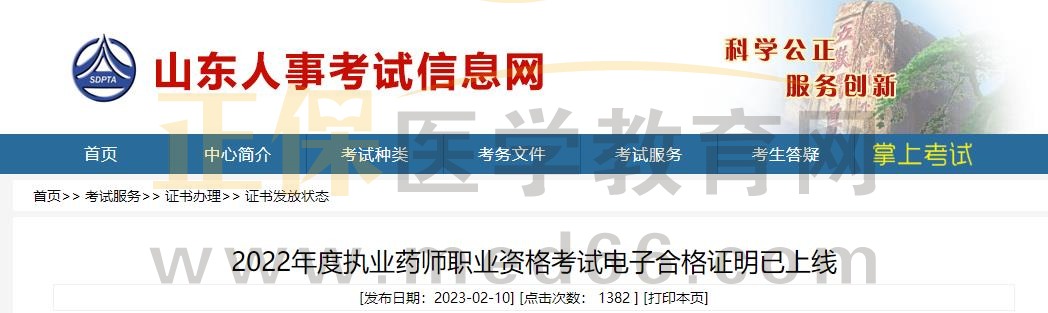 2022年度執(zhí)業(yè)藥師職業(yè)資格考試電子合格證明已上線。請考生通過山東人事考試信息網(wǎng)“證書辦理”欄目或愛山東APP進(jìn)行查詢、下載。