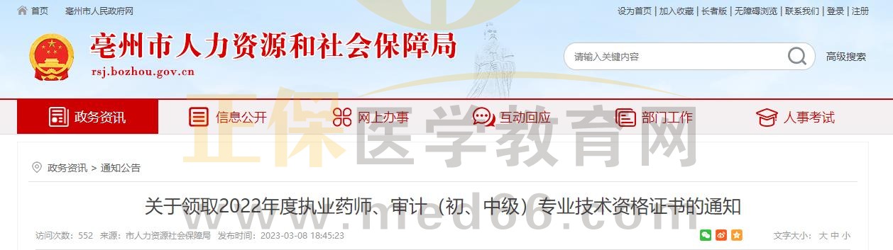 安徽亳州關于領取2022年度執(zhí)業(yè)藥師專業(yè)技術資格證書的通知