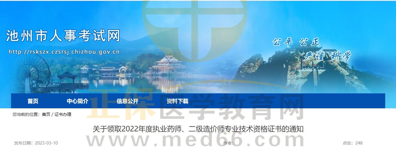 安徽池州關(guān)于領(lǐng)取2022年度執(zhí)業(yè)藥師專業(yè)技術(shù)資格證書的通知
