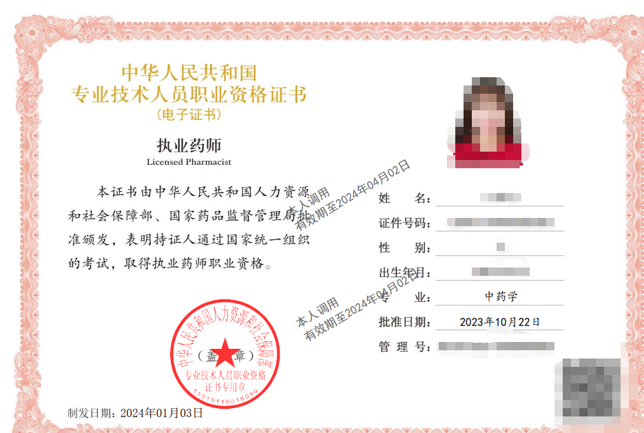 (執(zhí)業(yè)藥師電子證書示例)