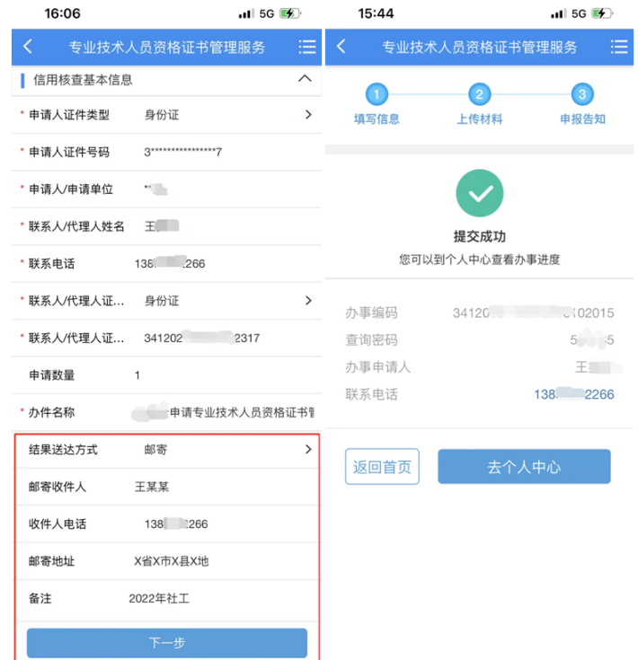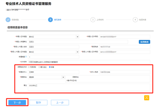 3.在“結果送達方式”中選擇“郵寄”,完善郵寄收件人姓名、電話、地址等信息,在“備注”欄填寫擬申領證書的考試年度和名稱,如“2022年社工”點擊“下一步”,最后在跳轉(zhuǎn)的頁面中點擊“提交”即可完成。