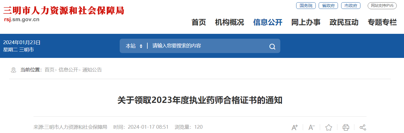 【福建三明市】關(guān)于領(lǐng)取2023年度執(zhí)業(yè)藥師合格證書的通知