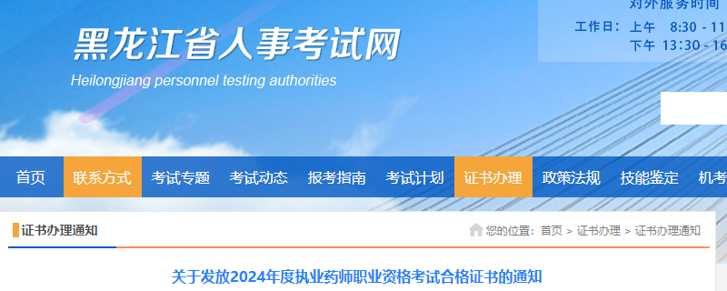 【黑龍江】關(guān)于發(fā)放2024年度執(zhí)業(yè)藥師職業(yè)資格考試合格證書的通知