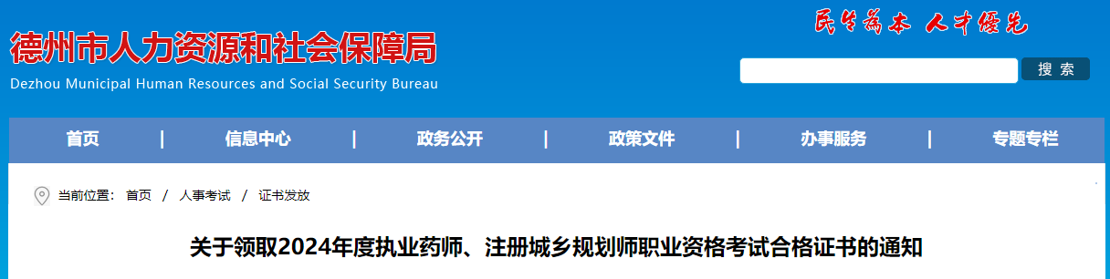 【山東德州】關(guān)于領(lǐng)取2024年度執(zhí)業(yè)藥師、注冊城鄉(xiāng)規(guī)劃師職業(yè)資格考試合格證書的通知