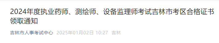 【吉林】2024年度執(zhí)業(yè)藥師、測(cè)繪師、設(shè)備監(jiān)理師考試吉林市考區(qū)合格證書領(lǐng)取通知