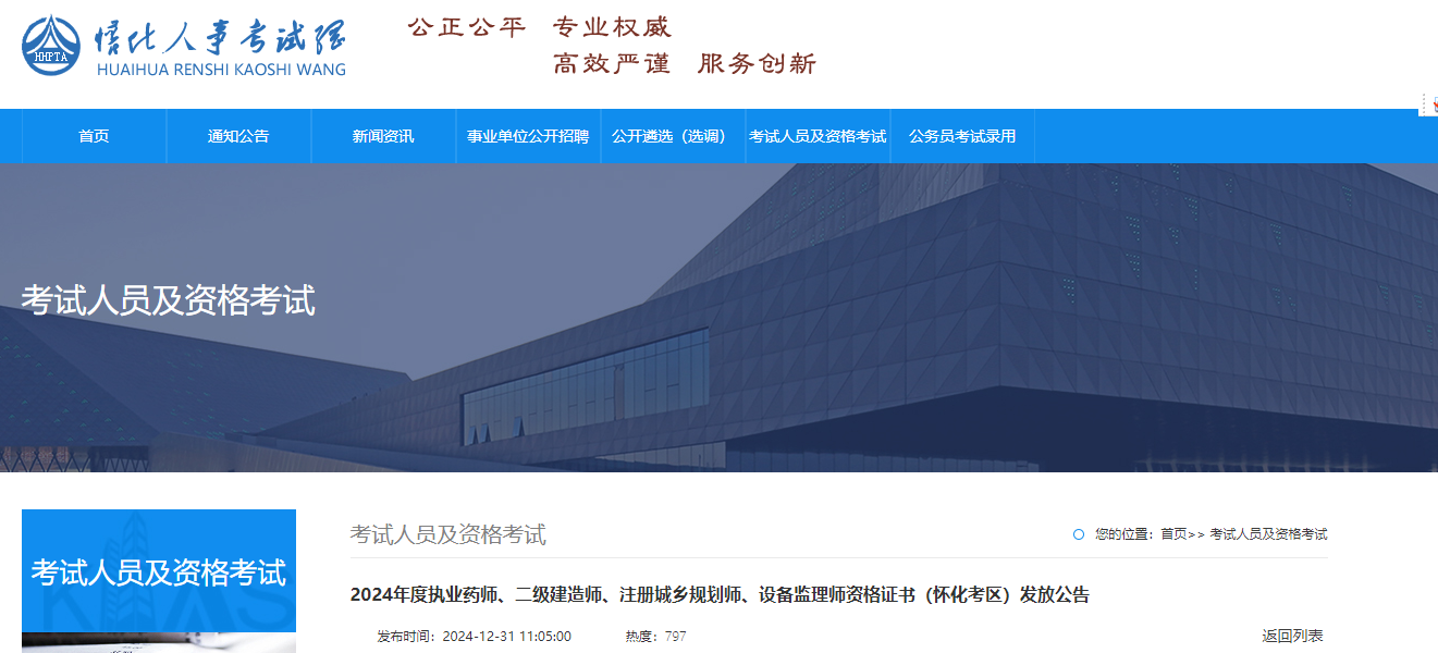 【湖南懷化】2024年度執(zhí)業(yè)藥師、二級建造師、注冊城鄉(xiāng)規(guī)劃師、設備監(jiān)理師資格證書(懷化考區(qū))發(fā)放公告