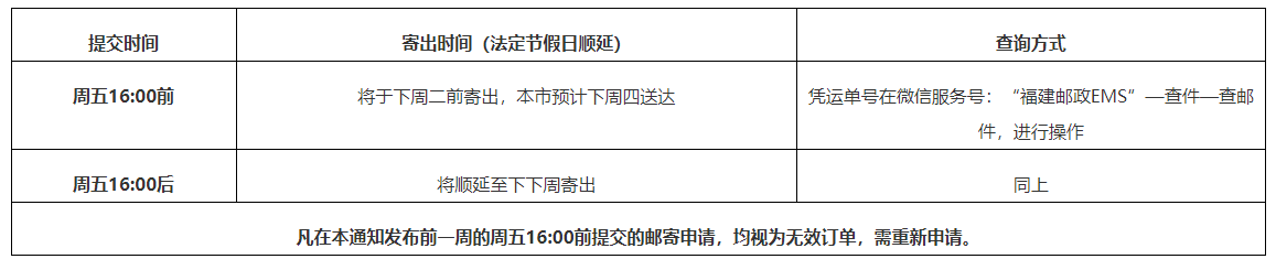 提交郵寄信息60分鐘內(nèi):如需修改信息或者查詢郵件單號,請通過微信服務(wù)號:“福建郵政EMS”——查件——個人訂單——委托郵寄,進(jìn)行操作;信息提交成功60分鐘后,如需修改信息,請重新掃描二維碼填寫申請信息并提交訂單。