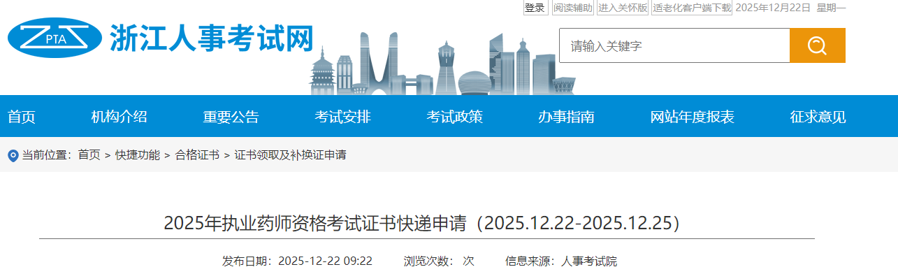 【浙江】2025年執(zhí)業(yè)藥師資格考試證書快遞申請