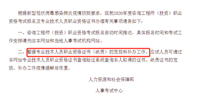 其實在中國人事考試網(wǎng)的《疫情防控期間有關(guān)事項的通告》文件中,已經(jīng)更新了相關(guān)內(nèi)容:暫緩專業(yè)技術(shù)人員職業(yè)資格證書(紙質(zhì))的發(fā)放和補(bǔ)辦工作。應(yīng)試人員可通過本網(wǎng)站專業(yè)技術(shù)人員職業(yè)資格證書查詢驗證系統(tǒng)查詢本人取得的證書。紙質(zhì)證書的發(fā)放、補(bǔ)辦工作疫情緩解后恢復(fù)。