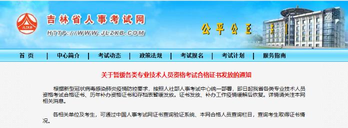 吉林省人事考試網(wǎng)在2020年2月5日的時候,發(fā)布了一個《關(guān)于暫緩各類專業(yè)技術(shù)人員資格考試合格證書發(fā)放的通知》,直接就說說明了關(guān)于證書延緩發(fā)放的事情。