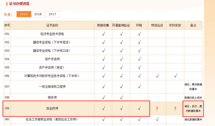 現(xiàn)在還有不少考生在后臺咨詢小編,什么時候可以發(fā)證。截止今天推文前,中國人事考試網(wǎng)依然顯示執(zhí)業(yè)藥師證書印制中。且湖北、武漢、貴州仍處于數(shù)據(jù)收集階段。
