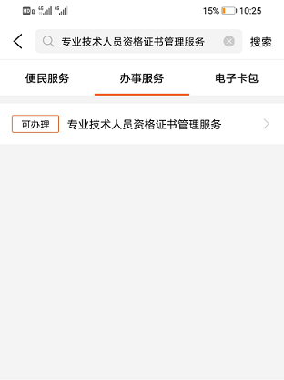 2.在搜索欄中搜索“專業(yè)技術(shù)人員資格證書管理服務(wù)”——“辦事服務(wù)”菜單下點(diǎn)擊“專業(yè)技術(shù)人員資格證書管理服務(wù)”