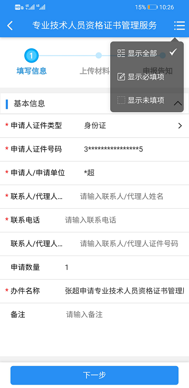 4.進(jìn)入界面點(diǎn)擊右上角選擇“顯示全部”(備注中請注明領(lǐng)取何種專業(yè)技術(shù)資格證書。)